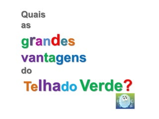 As principais vantagens do telhado verde incluem: (1) proporcionar conforto térmico e acústico aos ambientes, (2) diminuir o aquecimento dos ambientes durante o dia ao usar parte da energia solar, (3) contribuir para purificar o ar ao redor e melhorar a qualidade do ar, (4) atenuar a poluição do ar e isolar ruídos externos, deixando a temperatura interna sempre agradável.