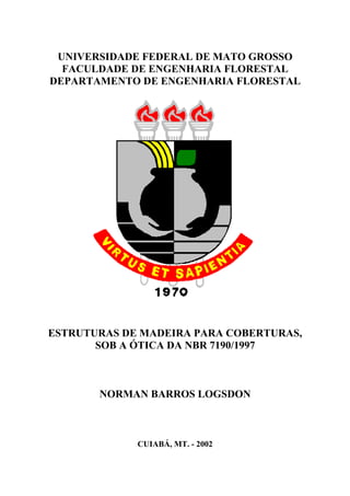 Este documento apresenta informações sobre estruturas de madeira para coberturas de acordo com a NBR 7190/1997, incluindo tipos de coberturas e telhas, tramas, estruturas principais, contraventamentos e roteiro para cálculo simplificado de telhados.