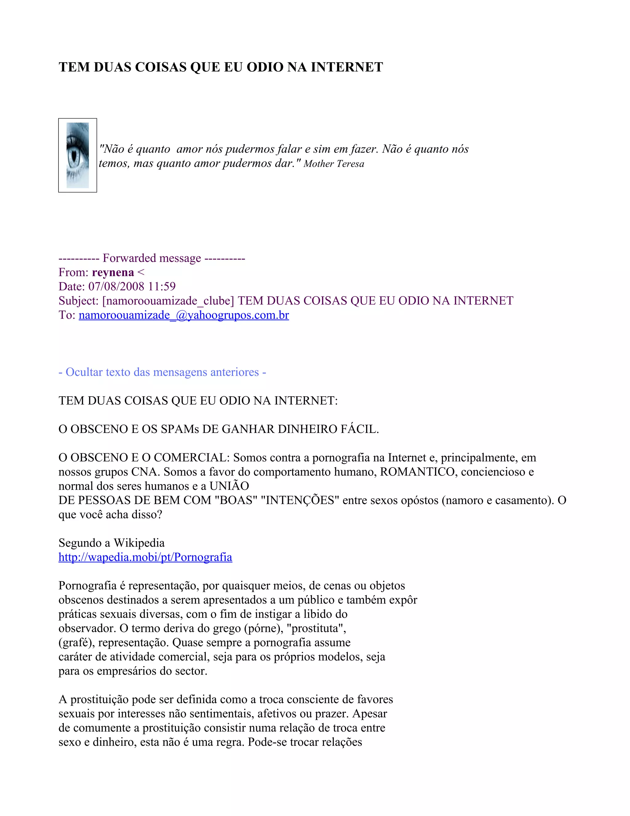 O documento expressa a aversão do autor à pornografia na internet e ao envio de spam, buscando promover um ambiente saudável para relacionamentos. É mencionado o impacto da pornografia online, a proposta de criar um domínio específico para sites pornográficos e a necessidade de legislações que restrinjam esse conteúdo. A comunicação é direcionada aos membros de um grupo online, reforçando a política de banimento para aqueles que desrespeitam suas regras.