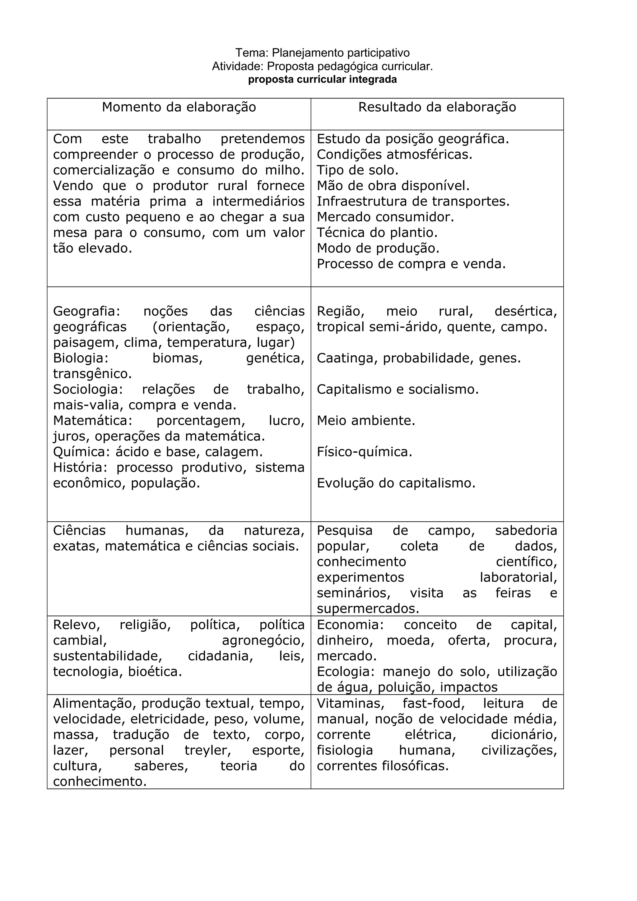 O documento propõe um plano de estudos interdisciplinar sobre a produção, comercialização e consumo do milho. O plano abordaria tópicos de geografia, biologia, sociologia, matemática, química, história e economia relacionados ao cultivo do milho, desde a posição geográfica e condições do solo até o processo de compra e venda.