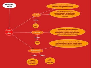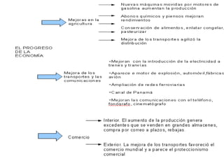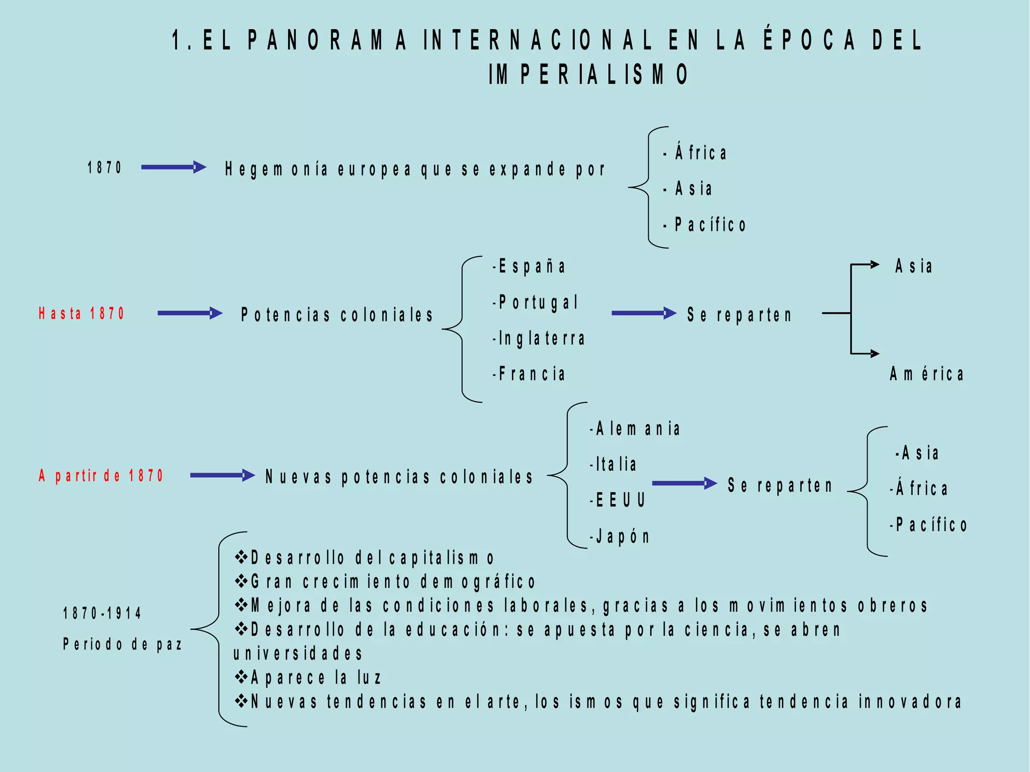 Este documento resume el panorama internacional durante la época del imperialismo entre 1870 y 1914. Durante este período, las potencias europeas como España, Portugal, Inglaterra y Francia se expandieron por África, Asia y el Pacífico, mientras que nuevas potencias como Alemania, Italia, EE.UU. y Japón también se involucraron en la carrera colonialista por estas mismas regiones. El documento luego analiza las causas y consecuencias del imperialismo colonial en las sociedades indígenas y las metrópolis europeas.