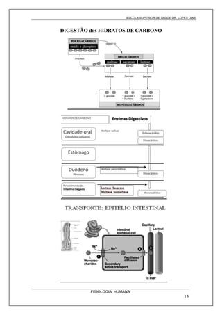 O documento discute os processos de digestão, absorção e transporte dos nutrientes no sistema digestivo humano. A digestão envolve a quebra de moléculas de alimentos em partículas menores para que possam ser absorvidas. A absorção ocorre principalmente no duodeno e jejuno, e os nutrientes são transportados para os tecidos, com o fígado recebendo água, íons, glicose e aminoácidos. O documento então detalha especificamente os processos para hidratos de carbono, proteínas, lípidos,