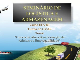 O documento descreve um seminário realizado por uma turma de um curso de logística e armazenagem sobre o tema "Cursos de educação e formação de adultos e a empregabilidade". O seminário contou com a participação de vários oradores como a AEP, ANQ e empresas empregadoras. Os oradores destacaram a importância da formação profissional para a empregabilidade e como a qualidade da formação aumenta as chances de inserção no mercado de trabalho.