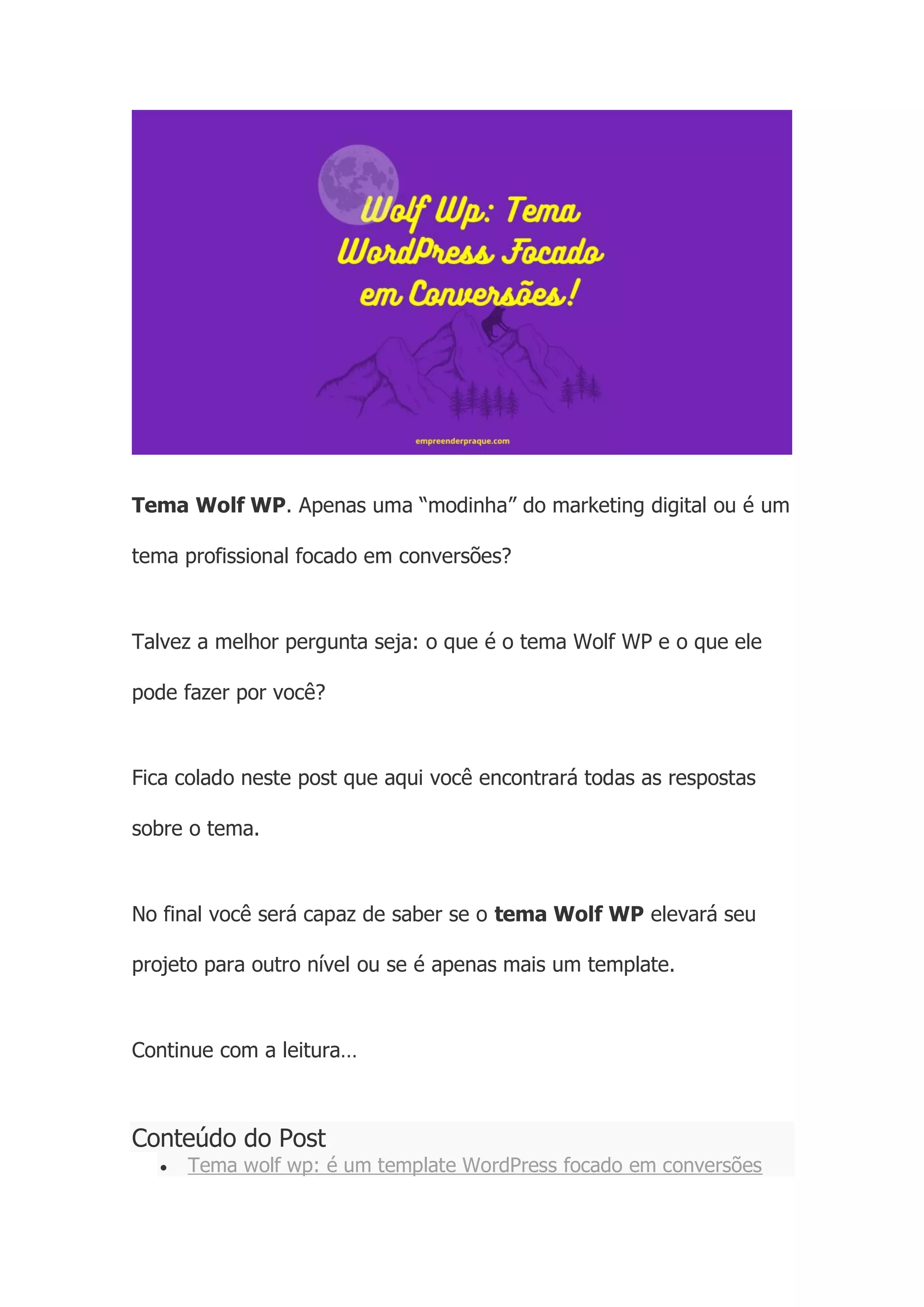 O documento discute as qualidades e funcionalidades do tema Wolf WP para WordPress, argumentando que ele é focado em conversões, fácil de usar e oferece vários bônus. O tema tem design profissional e responsivo, permite customização e facilita a criação de sites e blogs para converter leads.