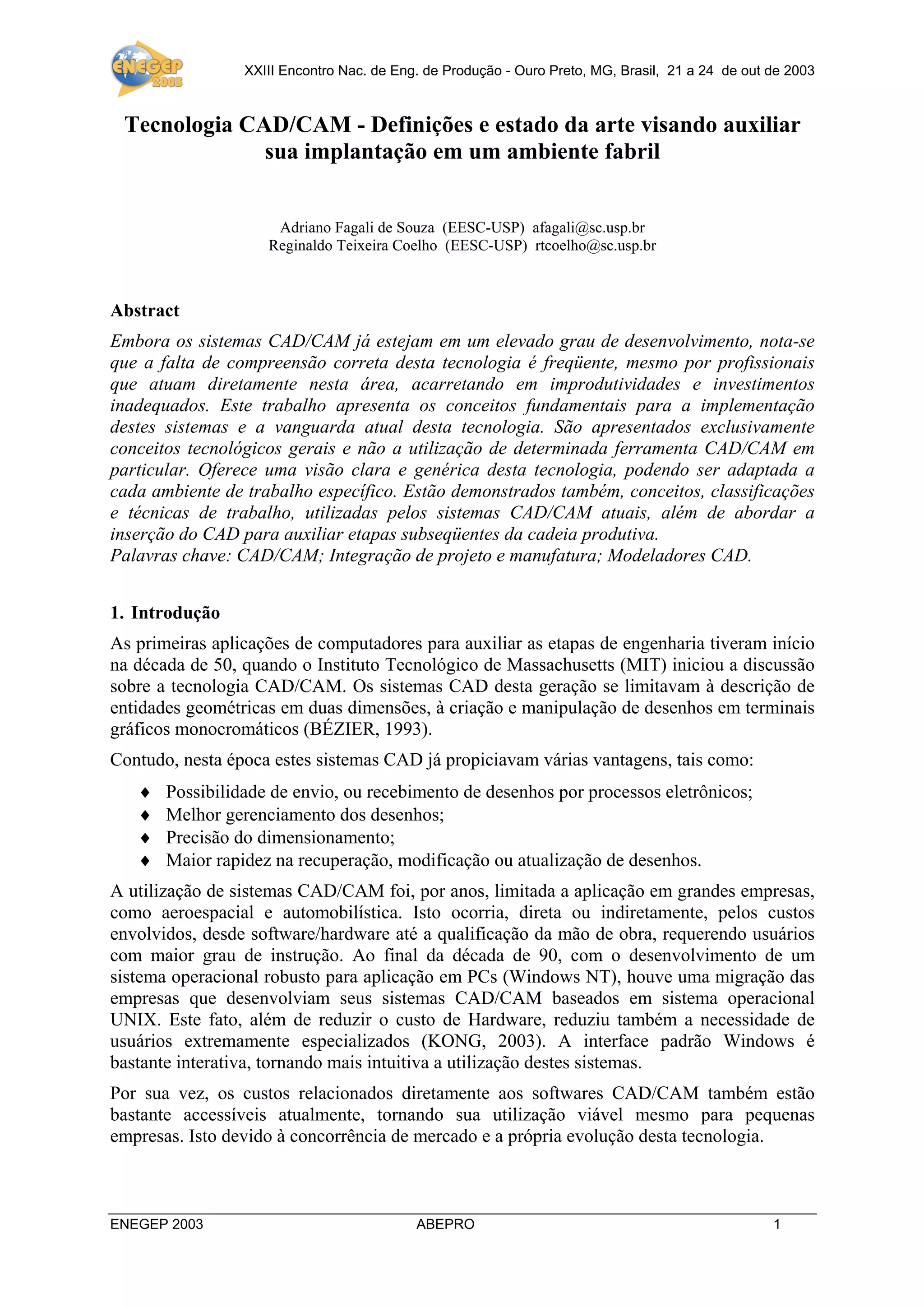 1) O documento descreve um trabalho apresentado no 23o Encontro Nacional de Engenharia de Produção sobre os conceitos fundamentais e estado da arte da tecnologia CAD/CAM para auxiliar sua implantação em ambientes fabris.