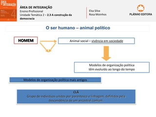 O documento descreve a evolução histórica dos modelos de organização política, desde os primeiros clãs e tribos até aos sistemas feudal, absolutista e democrático. Detalha os principais conceitos destes sistemas e como contribuíram para a construção da democracia moderna com base nos direitos humanos.