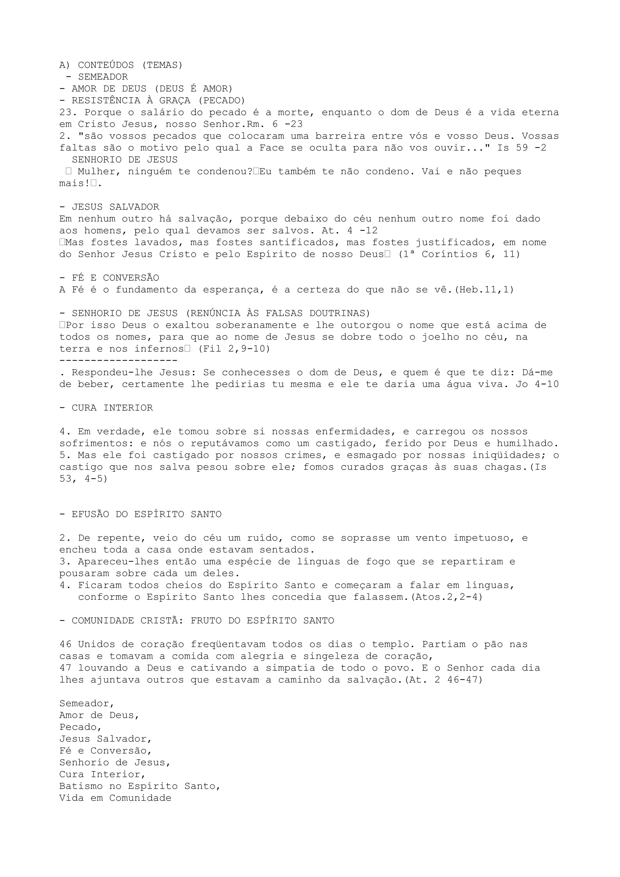 O documento discute vários temas cristãos como: 1) Semeador, amor de Deus e resistência ao pecado; 2) Jesus como salvador e senhor; 3) Fé, conversão e cura interior por meio de Jesus; 4) Batismo no Espírito Santo e vida em comunidade cristã.