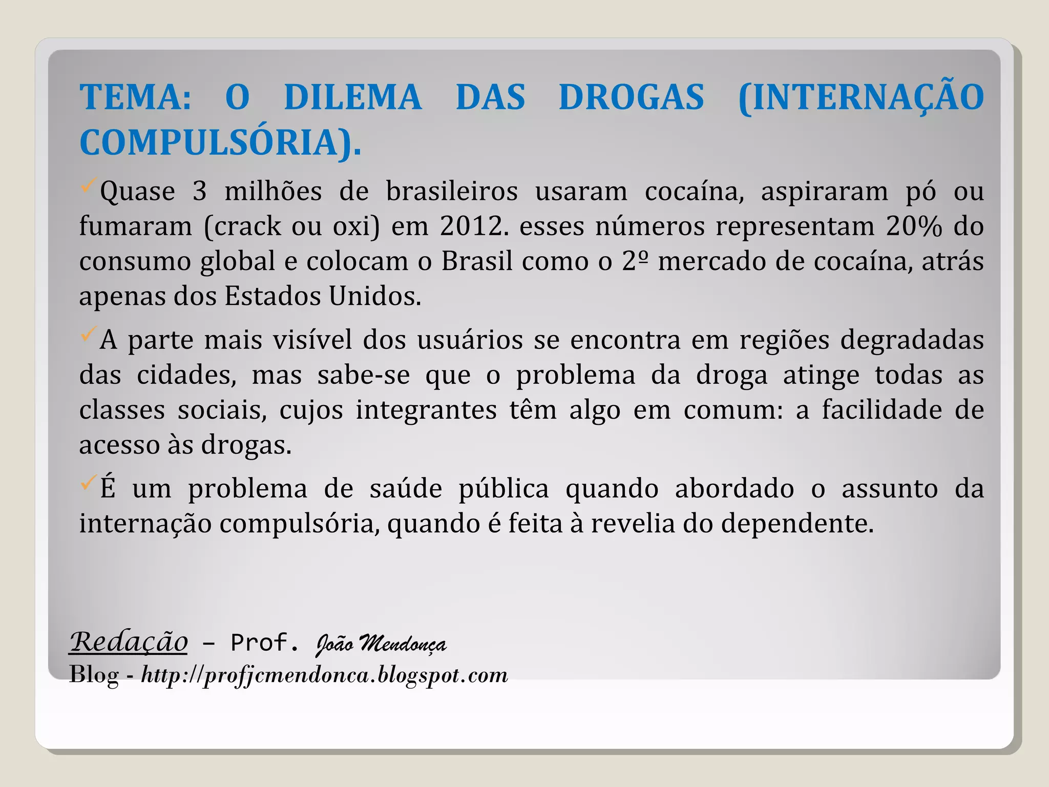 O documento discute o problema do uso de drogas no Brasil e a questão da internação compulsória de dependentes. Milhões de brasileiros usam drogas como cocaína e crack, com impactos em todas as classes sociais. Há debate sobre como enfrentar o problema, entre proibição, descriminalização e legalização. A internação compulsória gera discussões sobre liberdade individual versus intervenção estatal.