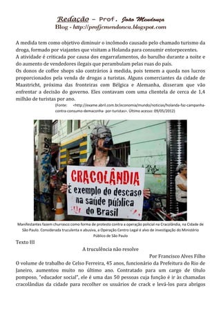 O documento discute as políticas públicas e o combate às drogas no Brasil, apresentando três textos sobre o tema. O Texto I fala sobre a operação policial na Cracolândia em São Paulo. O Texto II descreve novas regras na Holanda para limitar o turismo de drogas. E o Texto III critica a abordagem truculenta usada no Rio de Janeiro para internar usuários de drogas.