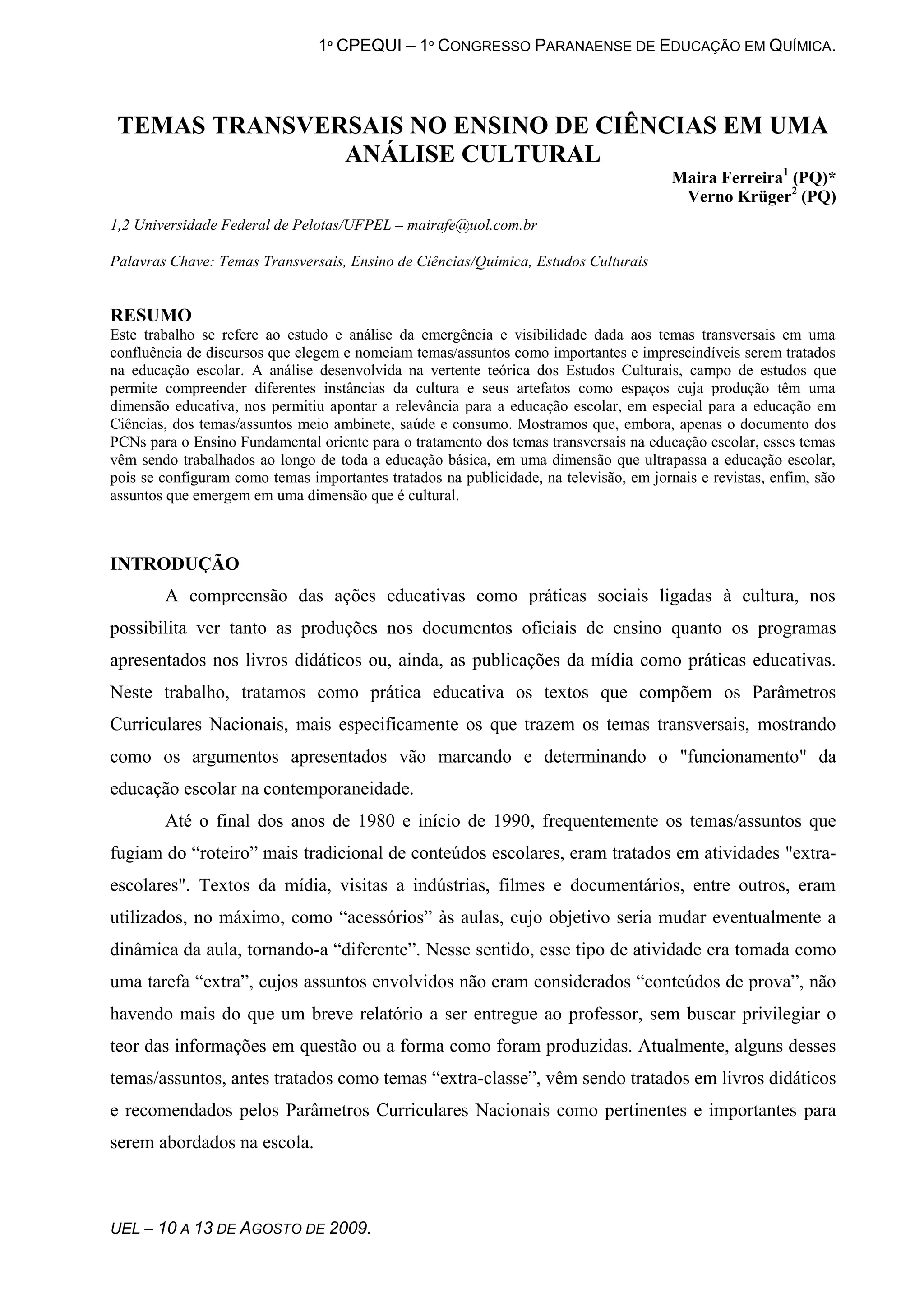 1) O documento discute a emergência e legitimação de temas transversais como conteúdos de ensino, analisando documentos como os Parâmetros Curriculares Nacionais.
