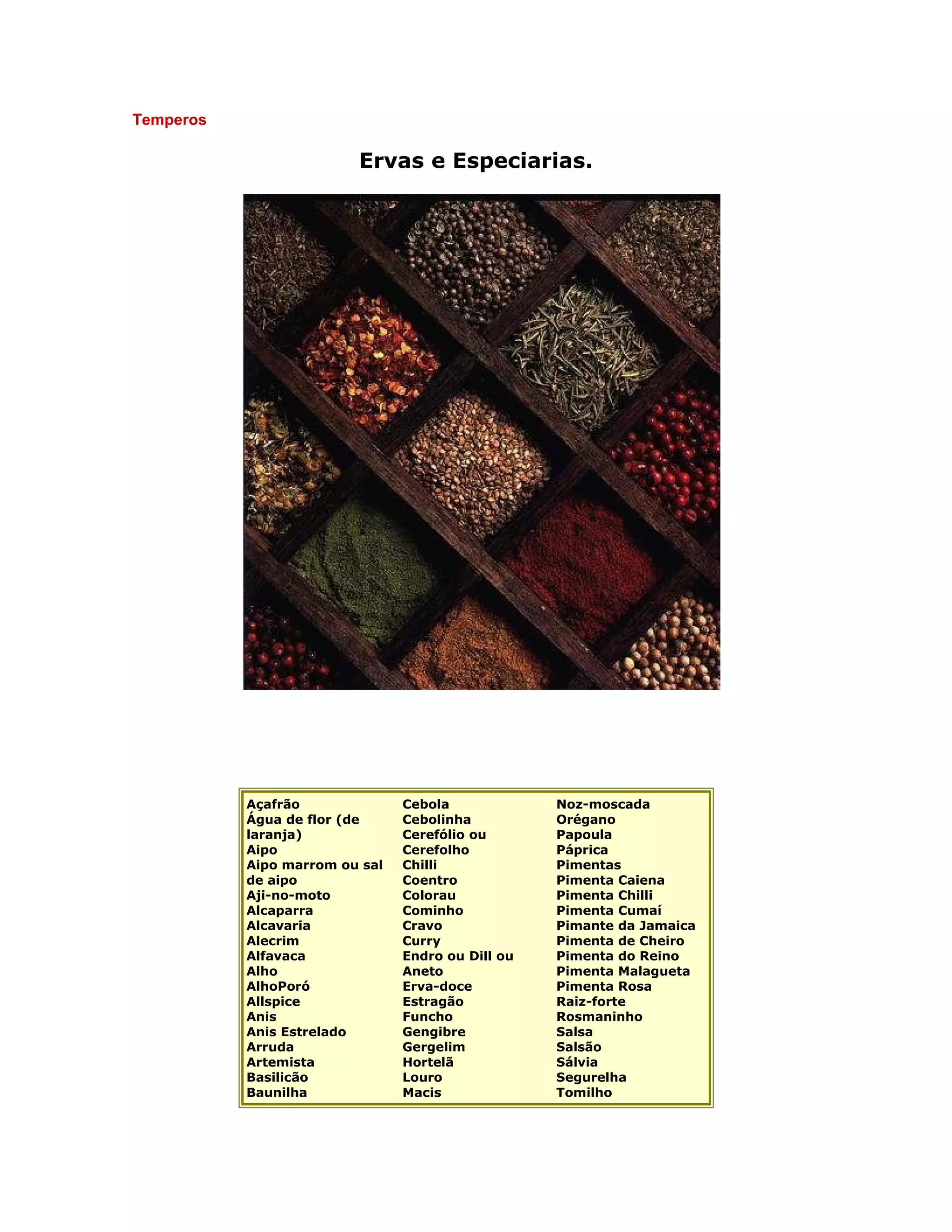 1) O documento lista diversas ervas e especiarias, descrevendo suas propriedades e usos culinários. É fornecido o nome científico e popular de cada tempero, bem como dicas de como usá-los para melhorar o sabor de pratos salgados e doces.