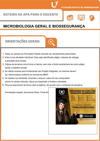 O documento aborda aspectos fundamentais da microbiologia geral e biossegurança, incluindo a importância da higiene das mãos e prevenção de infecções. Ele detalha a preparação de meios de cultura, enfatizando a técnica correta e os nutrientes necessários para o cultivo bacteriano. Além disso, discute a classificação dos meios de cultivo e os métodos de controle microbiano, essenciais para garantir a segurança em ambientes laboratoriais.