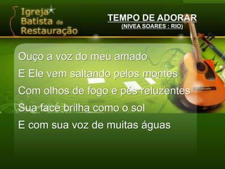 TEMPO DE ADORAR(NIVEASOARES : RIO)Ouço a voz do meu amadoE Ele vem saltando pelos montesCom olhos de fogo e pés reluzentesSua face brilha como o solE com sua voz de muitas águas