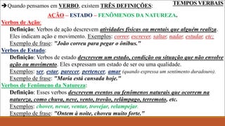 O documento discute os diferentes tipos de verbos e tempos verbais na língua portuguesa. Ele define verbos de ação, estado e fenômenos da natureza e explica as três conjugações verbais. O documento também descreve o modo indicativo, subjuntivo e imperativo e os diferentes tempos como pretérito, presente e futuro dentro do modo indicativo.