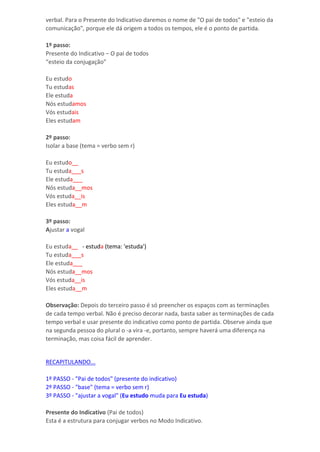 2) Aprensenta um método para conjugar verbos de forma fácil sem decorar, começando pelo presente do indicativo e isolando a base do verbo.