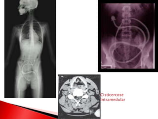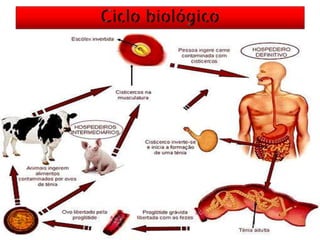 Este documento discute teníase e cisticercose, causadas por duas espécies de tênia - Taenia solium e Taenia saginata. A teníase ocorre quando humanos ingerem carne de porco ou boi crua infectada com a larva do parasita, enquanto a cisticercose ocorre quando humanos ingerem ovos do parasita eliminados em fezes humanas. O documento descreve os ciclos de vida dos parasitas, sintomas, diagnósticos e métodos de prevenção e controle dessas doenças.