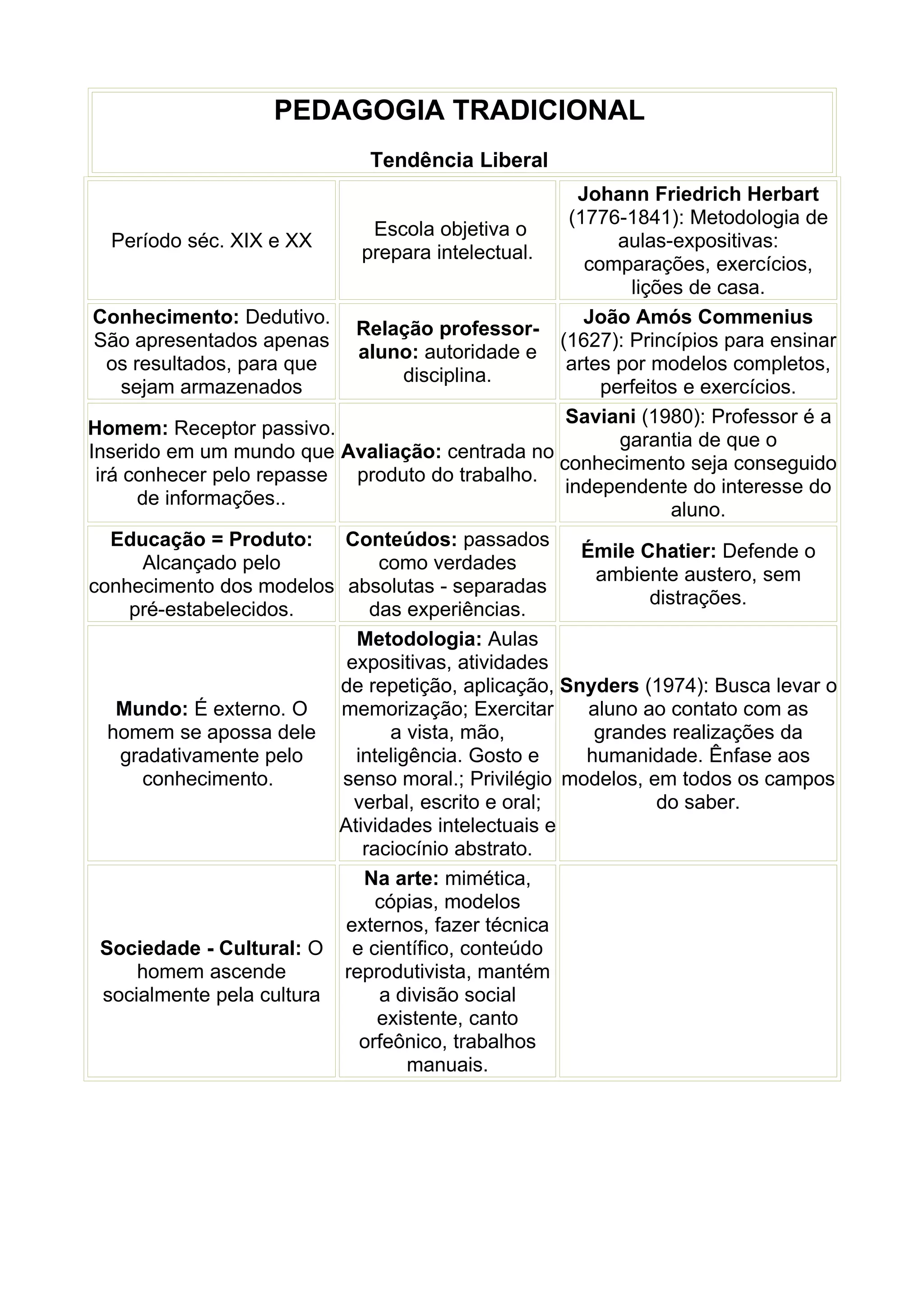 Este documento descreve as principais tendências pedagógicas ao longo dos séculos 19 e 20: