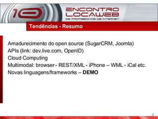 O documento discute as tendências da tecnologia da web em 2008, incluindo o amadurecimento de softwares livres como o Joomla e SugarCRM, o crescimento de APIs como a do Live.com e OpenID, a ascensão da computação em nuvem, a expansão da web para além do HTML através de formatos como REST/XML e iCal, e novas linguagens de programação como Ruby on Rails.