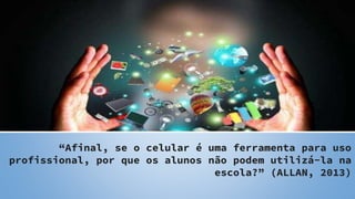 O documento discute os benefícios do uso das tecnologias digitais na educação. Aponta que as tecnologias como celulares e tablets são cada vez mais usadas por estudantes e devem ser incorporadas na escola, tornando o processo de ensino e aprendizagem mais interativo. Também destaca formas de usar essas ferramentas em atividades pedagógicas e o papel do professor em apoiar o uso das tecnologias.
