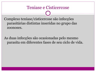 O documento discute as diferenças entre teníase e cisticercose, causadas pelo mesmo parasita em diferentes estágios de vida. A teníase ocorre quando o homem ingere carne crua infectada, enquanto a cisticercose ocorre quando o homem ingere ovos do parasita. A prevenção inclui cozinhar bem a carne e manter boas condições sanitárias.