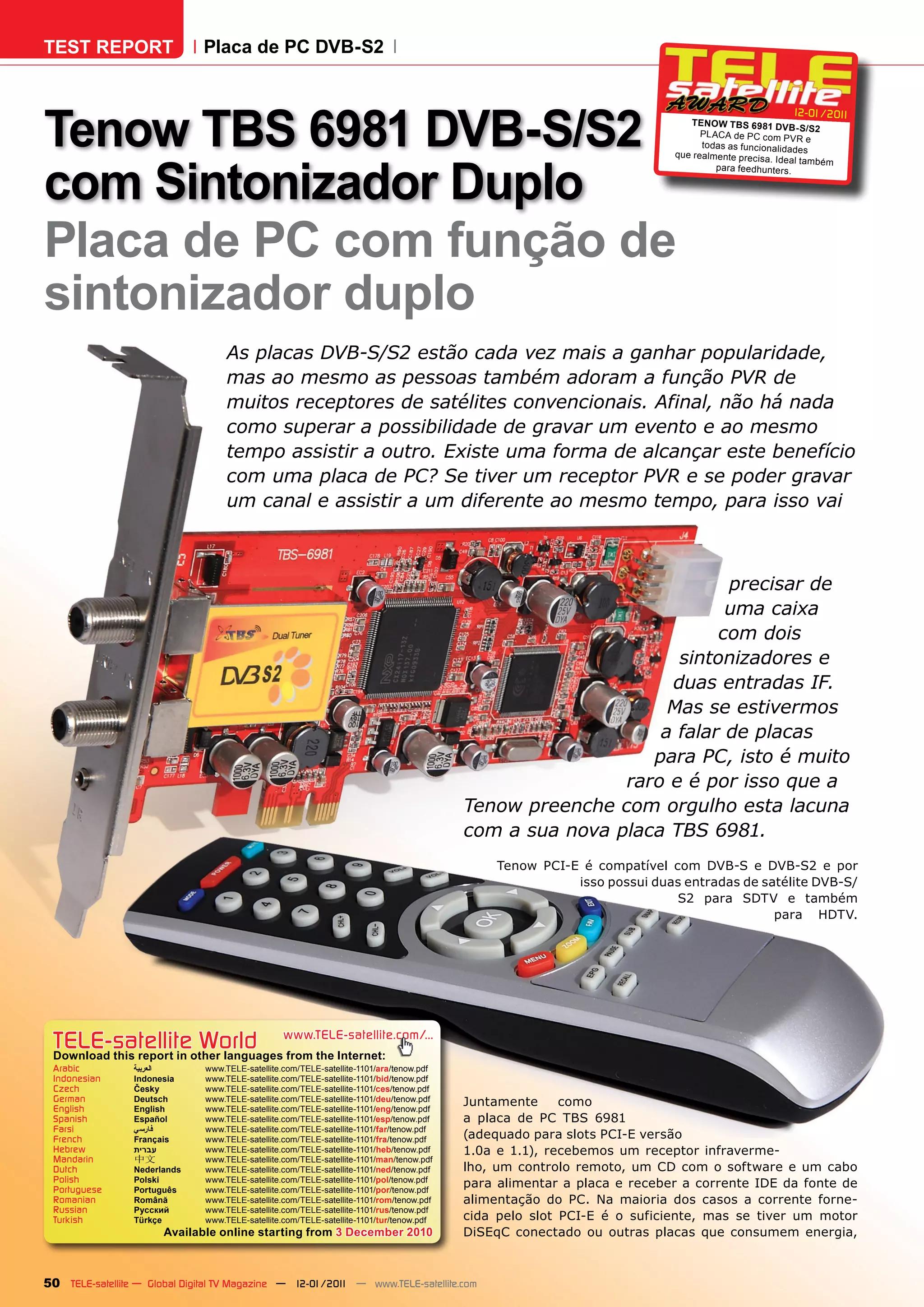 1) A placa TBS 6981 da Tenow possui dois sintonizadores DVB-S/S2 que permitem gravar um canal enquanto se assiste a outro;
