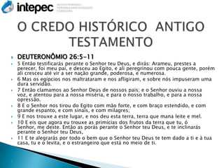 O documento descreve o credo histórico do povo de Israel, relatando (1) as origens como povo arameu prestes a perecer no Egito, (2) a opressão pelos egípcios, e (3) a libertação e condução à terra prometida por Deus após ouvir os clamores do povo.
