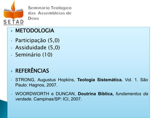 Este documento fornece um resumo da primeira aula de uma disciplina de Teologia. Apresenta definições iniciais de Teologia e Teontologia, discute a possibilidade e importância da Teologia e sua relação com a Religião. Também aborda evidências da existência de Deus e a questão da revelação divina.