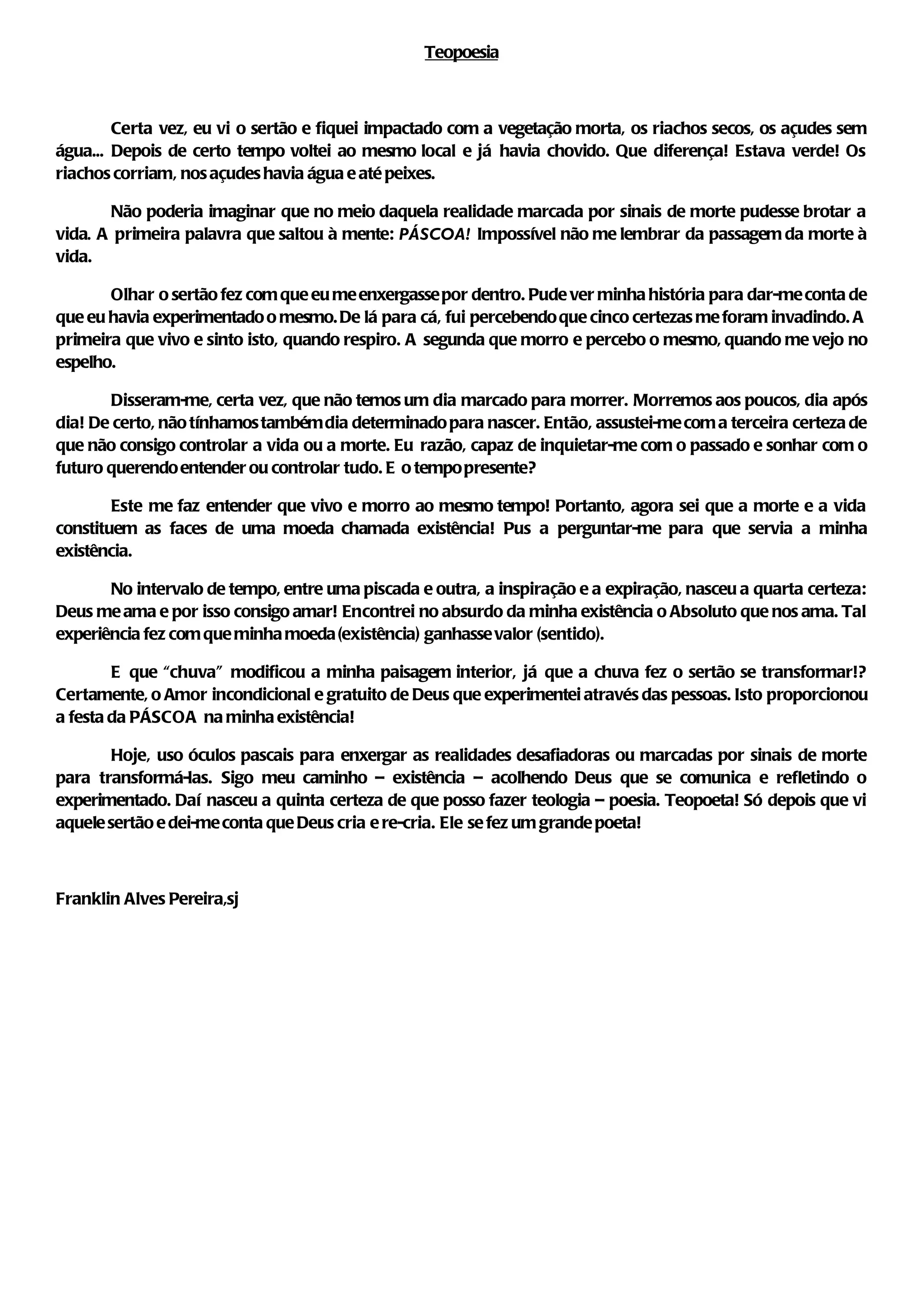 O documento descreve a experiência do autor ao ver um sertão seco que depois de chover ficou verde e com vida. Isso o levou a refletir sobre a passagem da morte à vida e como ele próprio já havia experimentado isso. O autor percebeu cinco certezas: que vive e sente quando respira, que morre quando se vê no espelho, que não controla a vida ou morte, que vive e morre ao mesmo tempo, e que Deus o ama e por isso consegue amar. Essa experiência deu sentido à sua existência.