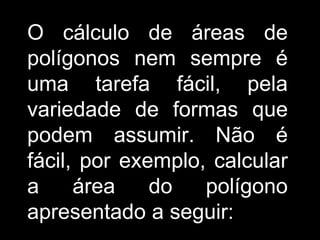 O documento descreve o Stomachion, um quebra-cabeça geométrico atribuído a Arquimedes, e o Teorema de Pick, que permite calcular a área de polígonos simples contando os pontos de fronteira e interiores. O documento apresenta exemplos de aplicação do Teorema de Pick para calcular áreas de vários polígonos.