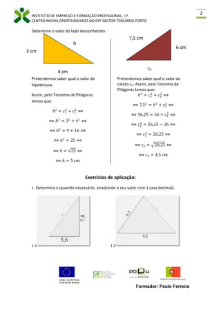 MATEMÁTICA PARA AVIDA<br />Formação Complementar<br />MV3B – Teorema de Pitágoras<br />h2=c12+c22Hipotenusa (h)Teorema de Pitágoras: Num Triângulo Rectângulo, o quadrado da hipotenusa é igual à soma do quadrado dos catetos.<br />Cateto (c1)<br />Cateto (c2)<br />Definições adicionais:<br />Triângulo Rectângulo: É um triângulo que tem um ângulo recto (ângulo com 90º de amplitude). Note que a soma dos ângulos internos de um qualquer triângulo é sempre 180º.<br />Catetos: São os dois lados que formam o ângulo recto de um triângulo rectângulo (lados adjacentes ao ângulo recto).<br />Hipotenusa: É o lado do triângulo rectângulo que é oposto ao ângulo recto (maior dos lados do triângulo rectângulo).<br />Quadrado de um número: O quadrado de um número é igual ao produto desse número por ele próprio, ou seja, é uma potência de expoente 2. Assim, a2 = a x a (Exemplos: 22 = 2 x 2 =4 ; 42= 4 x 4 = 16).<br />Raiz quadrada de um número: É a operação inversa do quadrado de um número. Assim, 𝑎2= 𝑎 (Exemplos: 4=2 porque 22 = 4; 9=3 porque 32 = 9; 16=4 porque 42 = 16).<br />Ordem das Operações: As multiplicações e divisões efectuam-se sempre antes das somas e das subtracções. (Exemplos: 32 + 42 = 3 x 3 + 4 x 4 = 9 + 16 = 25).<br />Exemplo: <br />7,5 cmDetermine o valor do lado desconhecido:<br />3 cmh<br />4 cm<br />Pretendemos saber qual o valor da hipotenusa.<br />Assim, pelo Teorema de Pitágoras temos que:<br />h2=c12+c12⟺<br />⟺h2=32+42⟺<br />⟺h2=9+16⟺<br />⟺h2=25⟺<br />⟺h=25⟺<br />⟺h=5 cm<br />6 cm<br />c2<br />Pretendemos saber qual o valor do cateto c2. Assim, pelo Teorema de Pitágoras temos que: <br />h2=c12+c22⟺<br />⟺7,52=62+c22⟺<br />⟺56,25=36+c22⟺<br />⟺c22=56,25-36⟺<br />⟺c22=20,25⟺<br />⟺c2=20,25⟺<br />⟺c2=4,5 cm<br />Exercícios de aplicação:<br />1. Determina x (quando necessário, arredonde o seu valor com 1 casa decimal).<br />1.11.2<br />1.31.4<br />1.5<br />
