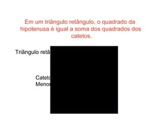 O documento explica o Teorema de Pitágoras, que estabelece que no triângulo retângulo, a soma dos quadrados dos catetos é igual ao quadrado da hipotenusa. O documento também define os termos hipotenusa, cateto maior, cateto menor e adjacente versus oposto em relação aos catetos de um triângulo retângulo.