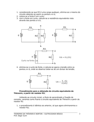 O documento descreve os teoremas de Thévenin e Norton para simplificação de circuitos elétricos. O teorema de Thévenin estabelece que qualquer circuito linear pode ser representado por uma fonte de tensão em série com uma impedância equivalente. Já o teorema de Norton permite simplificar circuitos em termos de correntes, representando-os por uma fonte de corrente em paralelo com uma resistência equivalente. Exemplos ilustram o procedimento para obter os equivalentes de Thévenin e Norton a partir de circuitos mais complexos.