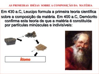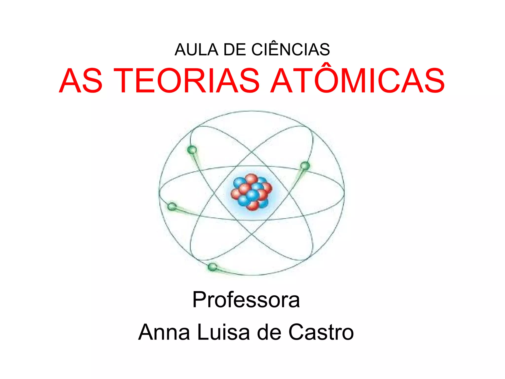 O documento discute as principais teorias atômicas ao longo da história, começando com as primeiras ideias de Demócrito e Aristóteles sobre a composição da matéria. Posteriormente, aborda as teorias de Dalton, Thomson e Rutherford sobre a estrutura do átomo, culminando no modelo atômico atual.