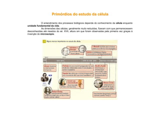 A célula é a unidade básica da vida. O documento descreve a evolução da compreensão da célula desde as primeiras observações no século XVII através do microscópio até à formulação da teoria celular no século XIX. Hooke foi o primeiro a usar o termo "célula" em 1667, enquanto Leeuwenhoek realizou as primeiras observações de materiais biológicos. Em 1838, Schleiden propôs que as plantas são constituídas por células e, em 1839, Schwann estendeu esta ideia