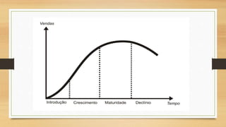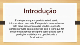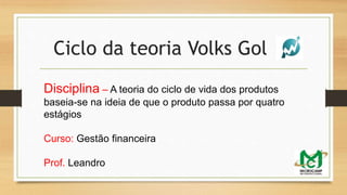 O documento aborda a teoria do ciclo de vida dos produtos, que se divide em quatro estágios: introdução, crescimento, maturidade e declínio. Cada estágio apresenta características específicas de vendas e lucros, culminando com a possível promoção do declínio pelo próprio produtor para introduzir novos produtos no mercado. Além disso, menciona detalhes sobre o automóvel Gol G5 e suas variantes, incluindo as preocupações com o preço e características do veículo.
