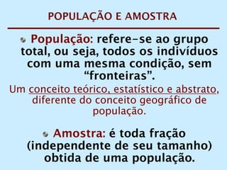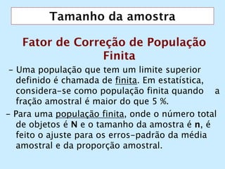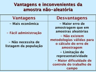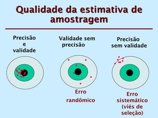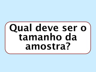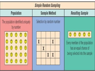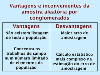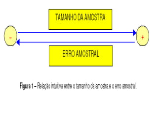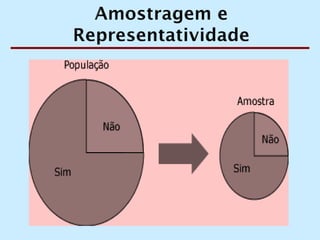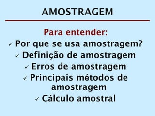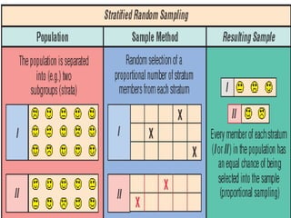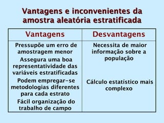 O documento discute os conceitos de amostragem simples e amostragem estratificada. A amostragem estratificada deve ser usada quando a população pode ser dividida em subconjuntos, para que a amostra reflita proporcionalmente cada subconjunto. Um exemplo ilustra como estratificar uma amostra com base no sexo para que seja representativa da população total.