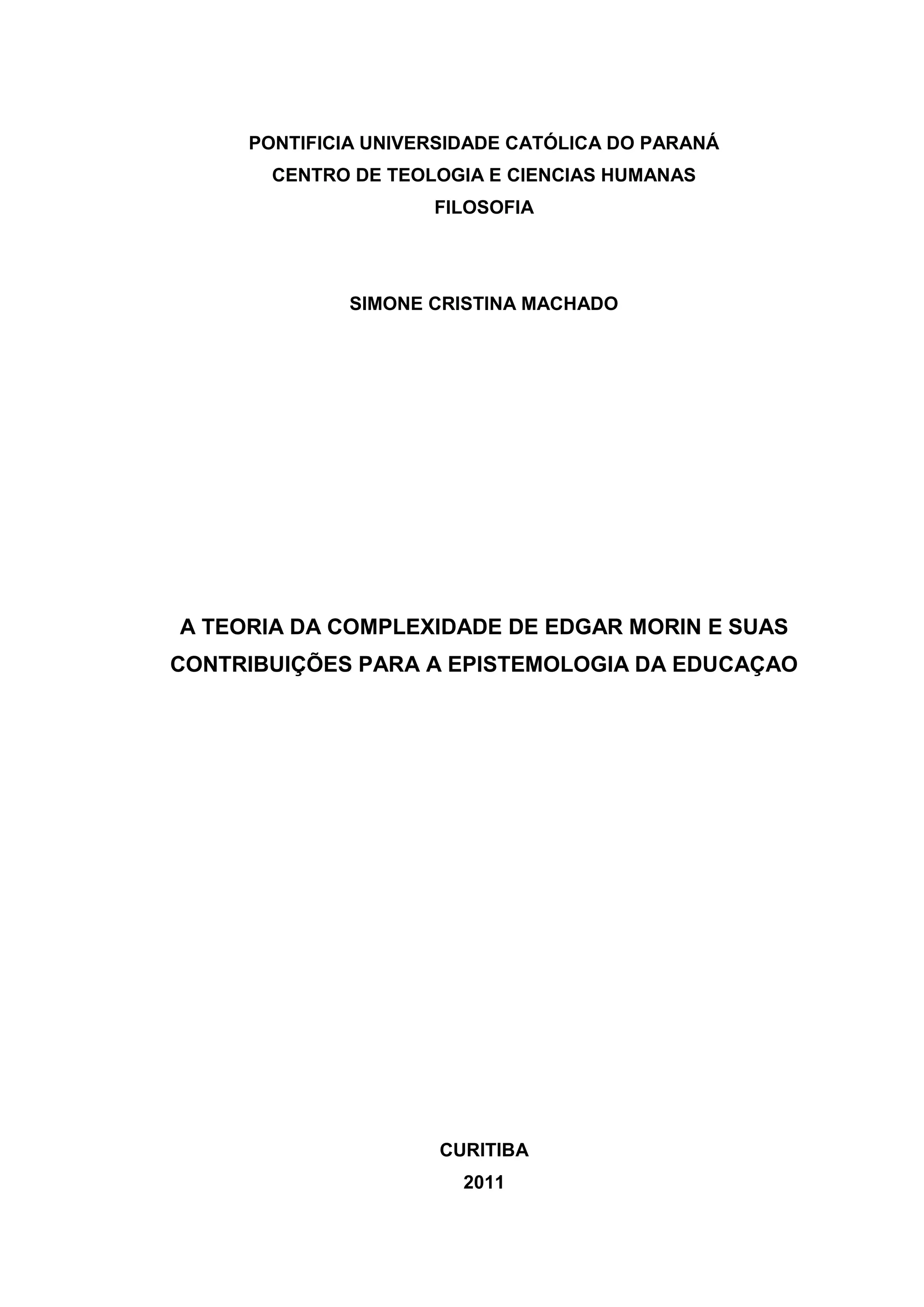 Este documento apresenta uma pesquisa sobre a teoria da complexidade de Edgar Morin e suas contribuições para a epistemologia da educação. O trabalho analisa as principais críticas de Morin à concepção moderna de conhecimento influenciada por Descartes e Bacon, e apresenta os fundamentos da teoria da complexidade proposta por Morin. Por fim, discute as consequências desta teoria no campo educacional.
