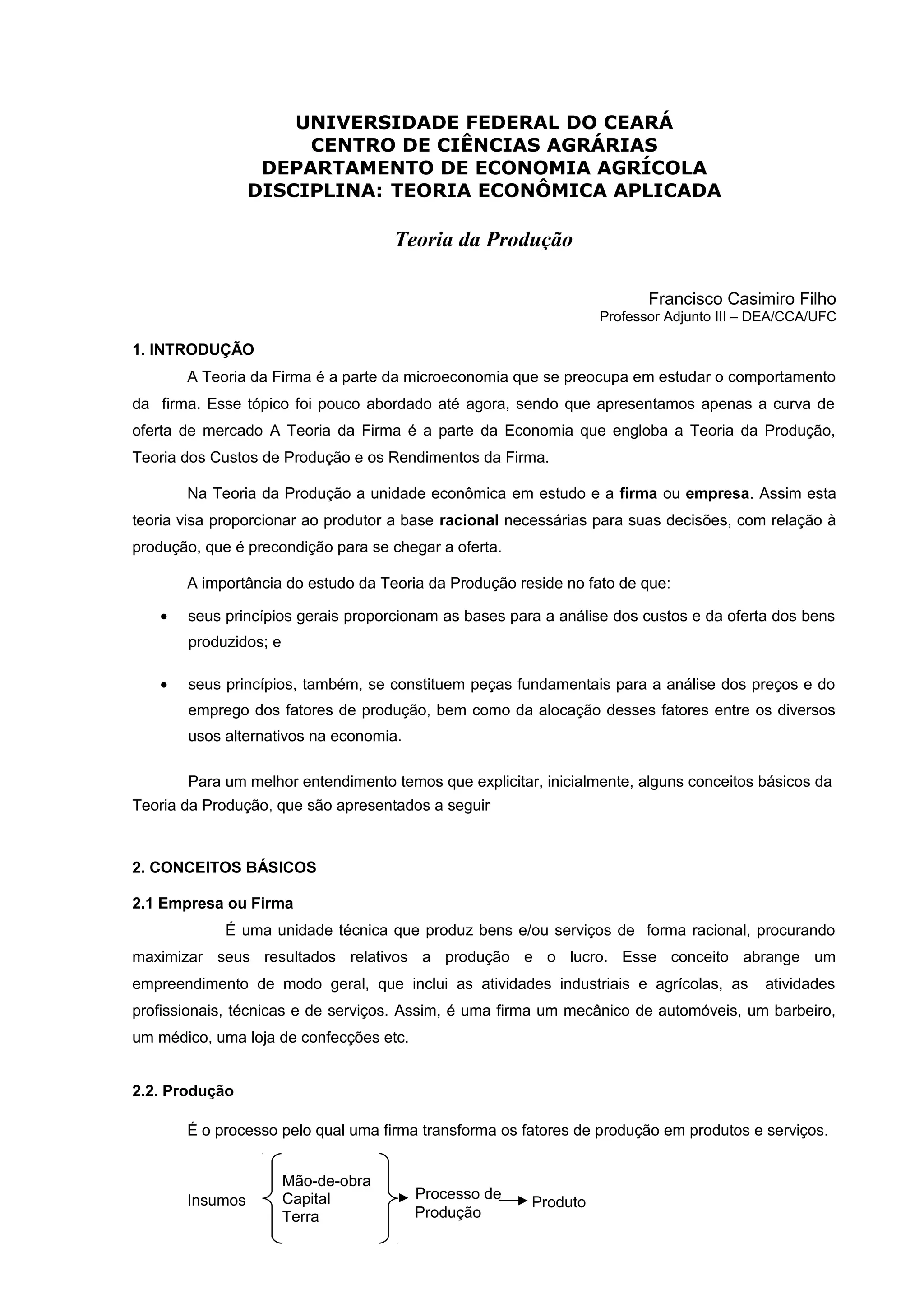 Este documento fornece uma introdução à teoria da produção, discutindo conceitos-chave como empresa, produção, processos produtivos, fatores de produção, curto e longo prazo, funções de produção, eficiência técnica e econômica, estágios da produção e determinação da quantidade ótima do fator variável. O documento destaca a importância de entender esses conceitos para analisar custos, oferta, preços e alocação de recursos na economia.