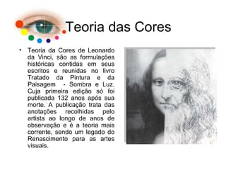 O documento discute a teoria das cores de Leonardo da Vinci, as cores primárias, secundárias e complementares, e como elas afetam a percepção visual. Também fornece dicas sobre como combinar cores de forma harmoniosa e o significado psicológico das cores.