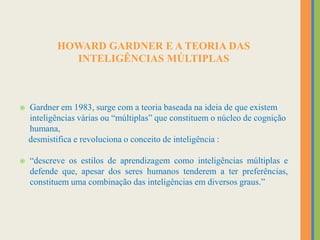 O documento discute a Teoria das Inteligências Múltiplas de Howard Gardner, que propõe que existem vários tipos de inteligência ao invés de uma inteligência geral. Gardner identificou oito inteligências principais incluindo linguística, lógico-matemática, espacial, corporal-cinestésica, musical, interpessoal, intrapessosal e naturalista. A teoria argumenta que as pessoas podem ter perfis de força diferentes nas várias inteligências.
