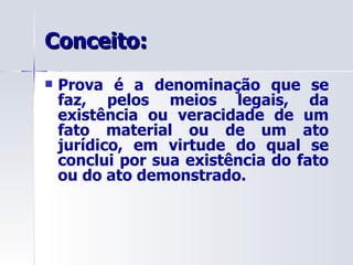 O documento apresenta os principais conceitos e princípios relacionados à teoria geral das provas no direito processual penal brasileiro. Aborda o conceito de prova, princípios como da não auto-incriminação e da identidade física do juiz, classificação de provas diretas e indiretas, provas ilícitas, sistemas de avaliação da prova como da persuasão racional, além de tratar do ônus da prova no processo penal.