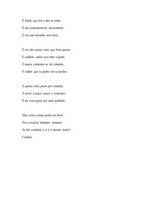 O documento pede aos alunos que analisem um dos poemas da apostila usando conceitos discutidos em aula, como figuras sonoras, organização sintática, vocabulário e categorias gramaticais. Apresenta dois poemas para análise: "Dor elegante", de Paulo Leminski, e "Amor, é fogo que arde sem se ver", de Luís Vaz de Camões.