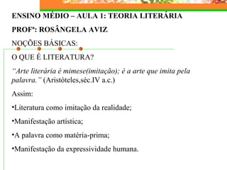 O documento apresenta uma aula de teoria literária que discute noções básicas como definição de literatura, funções da literatura, gêneros literários e elementos da versificação e métrica poética. É apresentada a distinção entre texto literário e não-literário e discutem-se conceitos como estilo individual, estilo de época e escolas literárias.