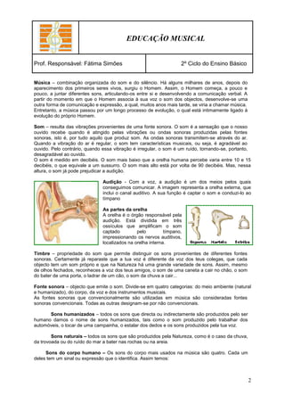 Este documento fornece informações sobre educação musical no 2o ciclo do ensino básico. Aborda conceitos como som, pulsação, ritmo, altura e intensidade. Também discute as partes da orelha, cuidados com a voz, e instrumentos musicais como a flauta de bisel e os instrumentos Orff.