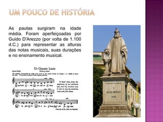 Guido d'Arezzo desenvolveu o sistema de notação musical no século XI, atribuindo nomes às notas baseado em hinos. Este sistema evoluiu ao longo do tempo e permitiu representar propriedades como altura, duração, intensidade e timbre dos sons por meio de símbolos na pauta musical.