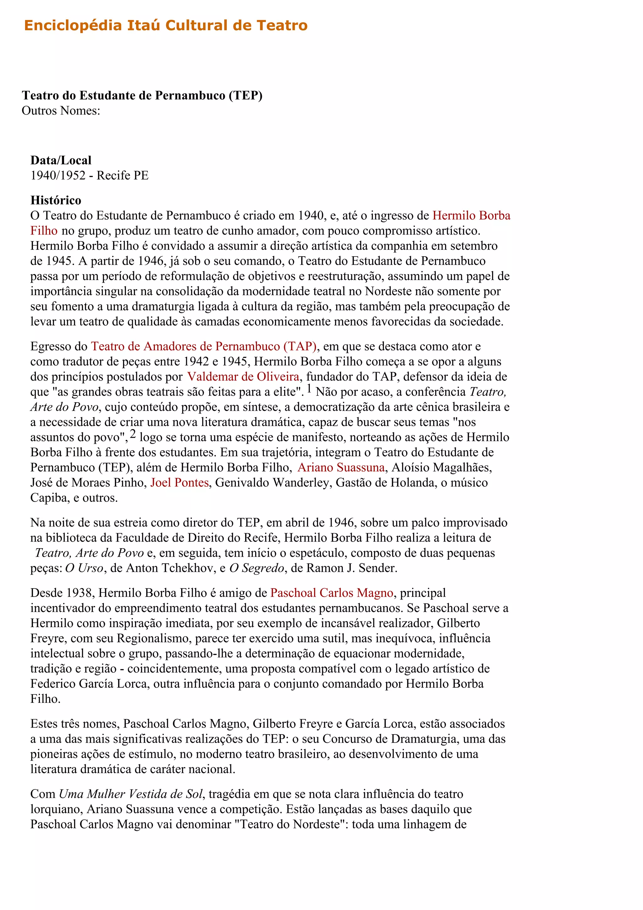 O Teatro do Estudante de Pernambuco (TEP) foi fundado em 1940 em Recife, Pernambuco, e se tornou um grupo teatral profissional e comprometido com a democratização do teatro sob a liderança de Hermilo Borba Filho a partir de 1946, produzindo peças clássicas e de dramaturgos nordestinos com temáticas regionais para o público de camadas menos favorecidas. Apesar do sucesso artístico, o TEP enfrentou dificuldades financeiras que levaram ao seu en