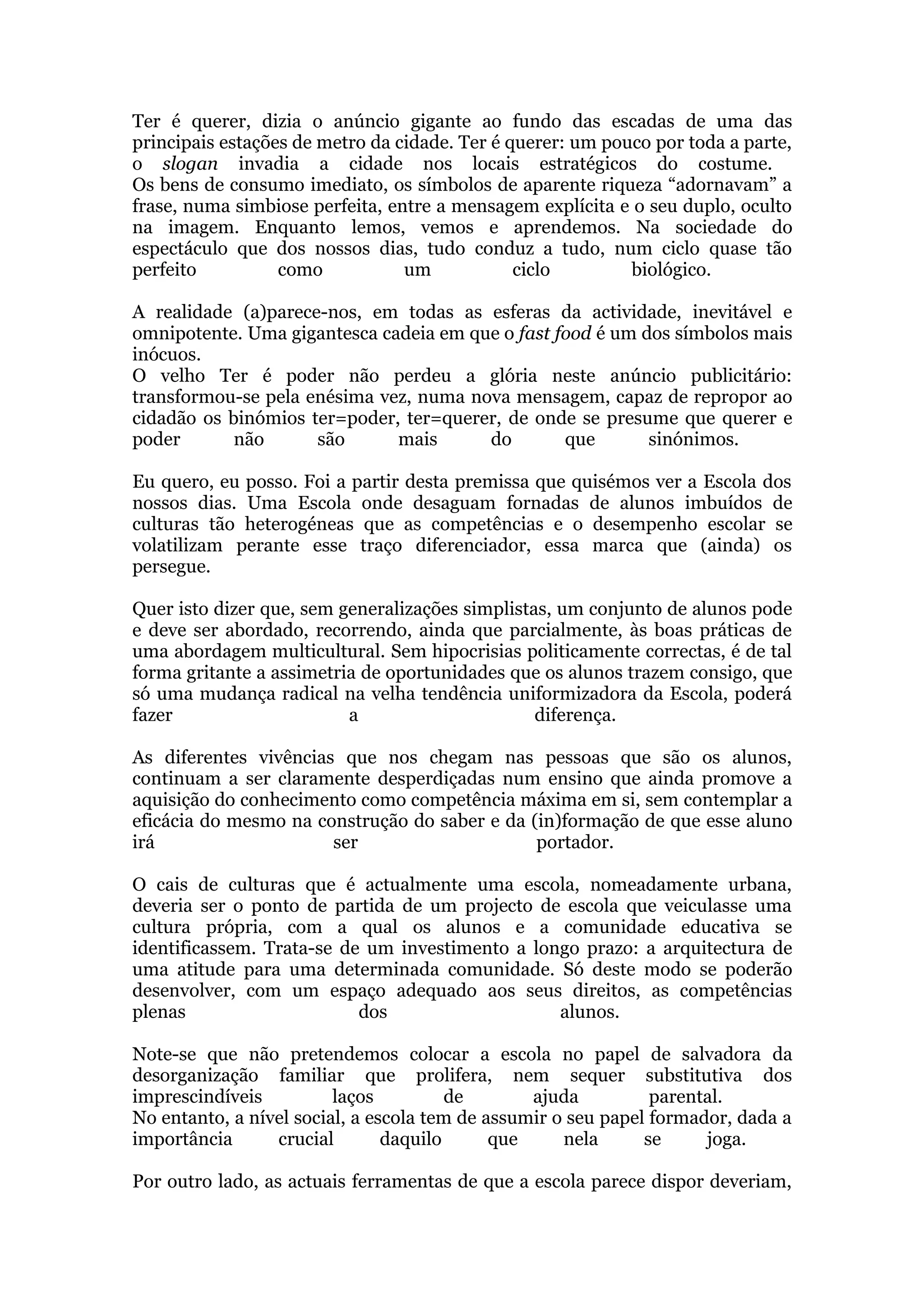 O documento discute como a sociedade de consumo promove a ideia de que ter é igual a querer e poder. Também analisa como as escolas lidam com alunos de culturas e backgrounds diversos, sugerindo que as escolas devem adotar abordagens multiculturais e desenvolver uma cultura própria para melhor integrar todos os alunos.