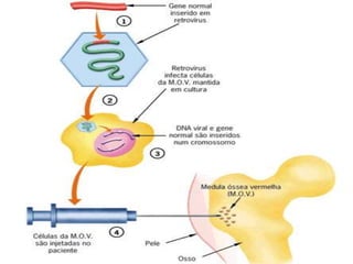 O documento discute a terapia gênica, definindo-a como a transferência de material genético para prevenir ou curar doenças. Explica que envolve identificar o gene causador da doença, isolá-lo e transferi-lo para o organismo, usando vetores virais ou não virais. Também aborda os desafios da terapia gênica, como a possibilidade de induzir tumores ou desordem genética, além do uso em estética e questões éticas relacionadas.