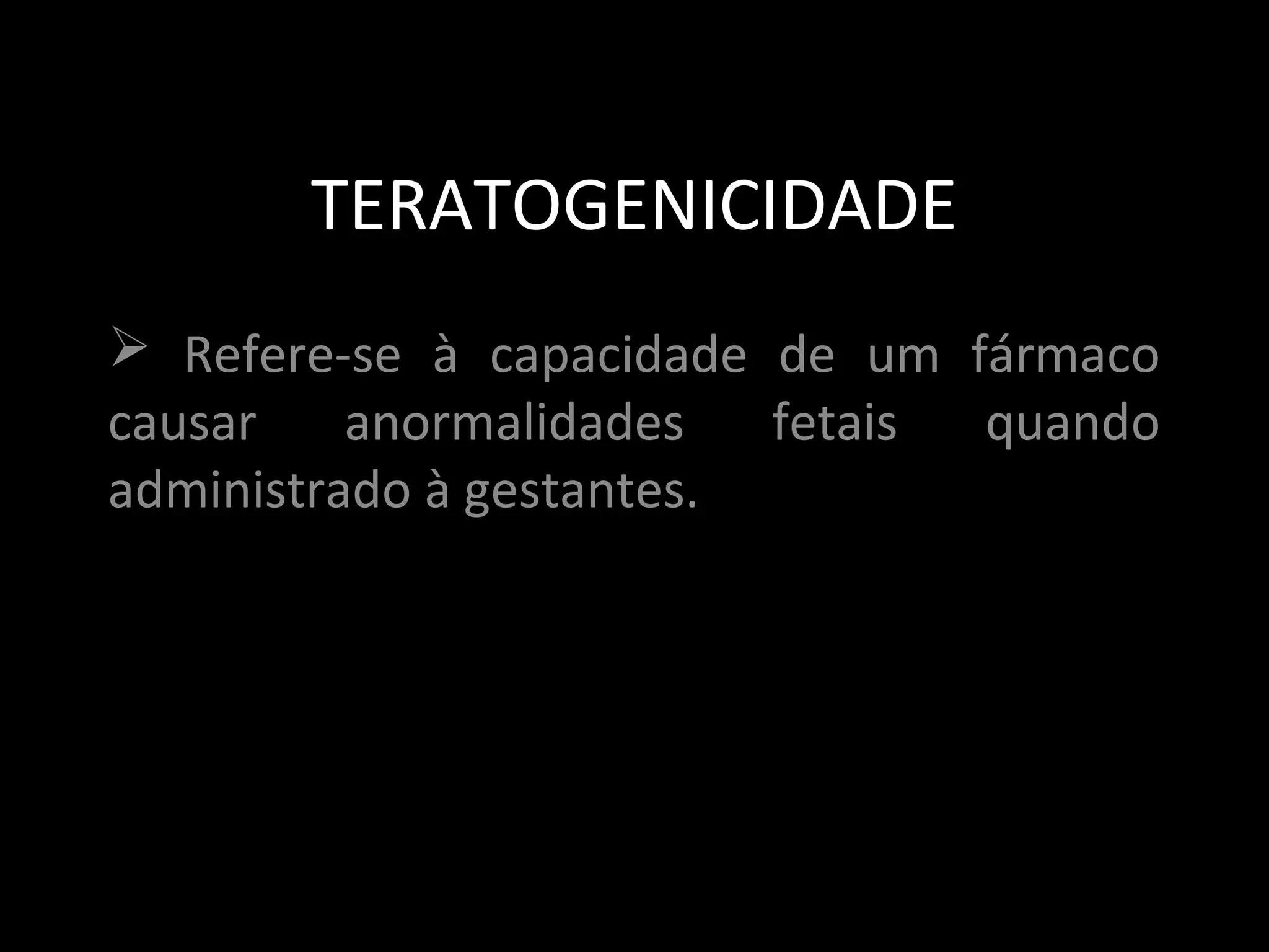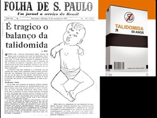 O documento discute teratogenicidade, ou a capacidade de fármacos causarem anormalidades fetais. Ele explica que qualquer droga pode atravessar a placenta e afetar o embrião, que é particularmente vulnerável. O desastre da Talidomida em 1958 ilustra como drogas podem causar má-formações como focomelia. Drogas podem ter efeitos teratogênicos em três estágios do desenvolvimento fetal.