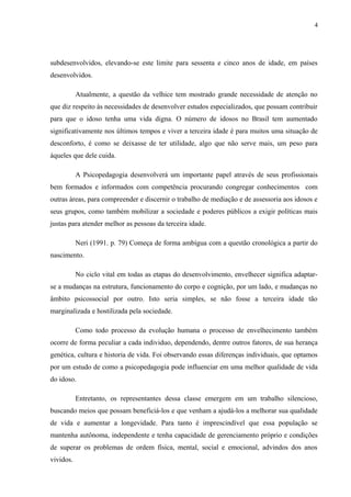 O documento discute a influência da psicopedagogia na terceira idade. Aborda o histórico do tratamento da velhice ao longo dos séculos, a importância da qualidade de vida dos idosos e como a psicopedagogia pode ajudá-los a se sentirem mais úteis e integrados à sociedade.